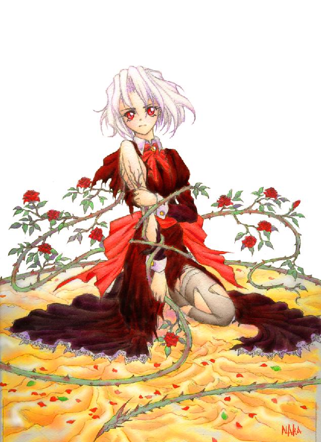 自分が他の人間と違うことに気付いたのは、いつだったろうか。 成長の遅い身体、出所のわからない慢性的な空腹感、発作的に襲う飢餓衝動。 日の光に弱く、昼間は屋内から出たくなかった。 それでも、先天的に身体が弱いということで、まだ普通に近い生活ができていた。 でも、あるとき街を襲った恐怖が、その日常を終わらせた。 それはストレートに、吸血花と呼ばれた。 動物の体内に根を張り、血を吸い上げて真紅の花を咲かせる寄生植物。 ツタが能動的に動き、近くの動物に種を植え付けて繁殖する。 それによる負荷は、強靭なミュータントならいざ知らず 並の人間には耐えがたい代物であり、大勢の犠牲者が出た。 母も友人も、近しい人たちは皆いなくなった。 そんな中で、自分だけは平気だった。 最初の頃こそ激痛と共に発熱したが、直にそれは収まった。 後に残ったのは、自己を見失いかねない程の空腹感。 そして未だ身体に寄生したままのその植物はツタを伸ばし、 近くの人間の血を吸い始める。 なんということだろう、その植物は自分の身体と一体化していた。 後で聞いた話によると、細胞レベルで一種の共生状態になっているとか。 基本的には自分の意思で操作できるのだが、 生体の危機においては、防衛本能が表面化するようだった。 その日いらい、自分には安らぐことがなくなった。 自分の身体を、理性を、植物の支配権を維持するために、 今日も血を求めてさ迷う。 いつか、平穏な時を手に入れることを夢見て。